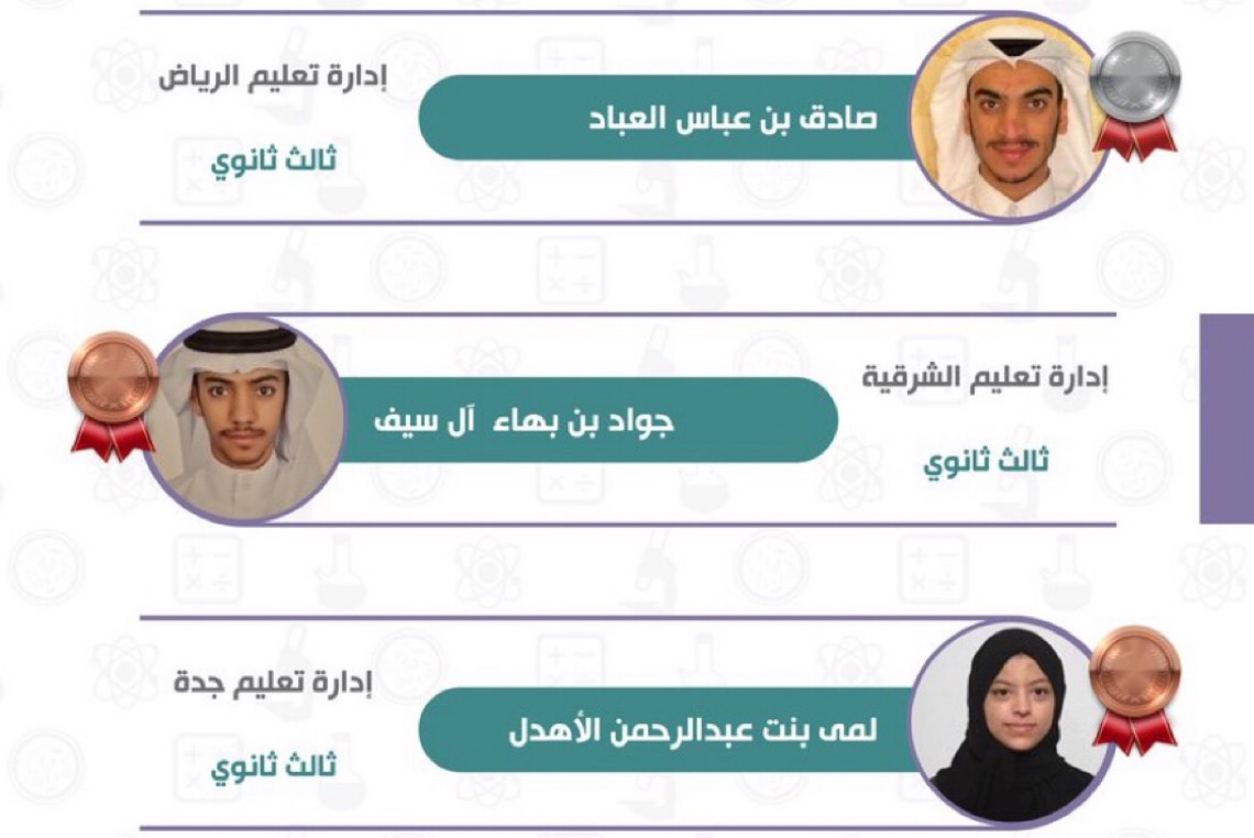 وحصد الطالب صادق العباد من تعليم الرياض الميدالية الفضية، بينما حصل الطالب جواد السيف من تعليم الشرقية على الميدالية البرونزية، وحصلت الطالبة لمى الأهدل من تعليم جدة على الميدالية البرونزية.
