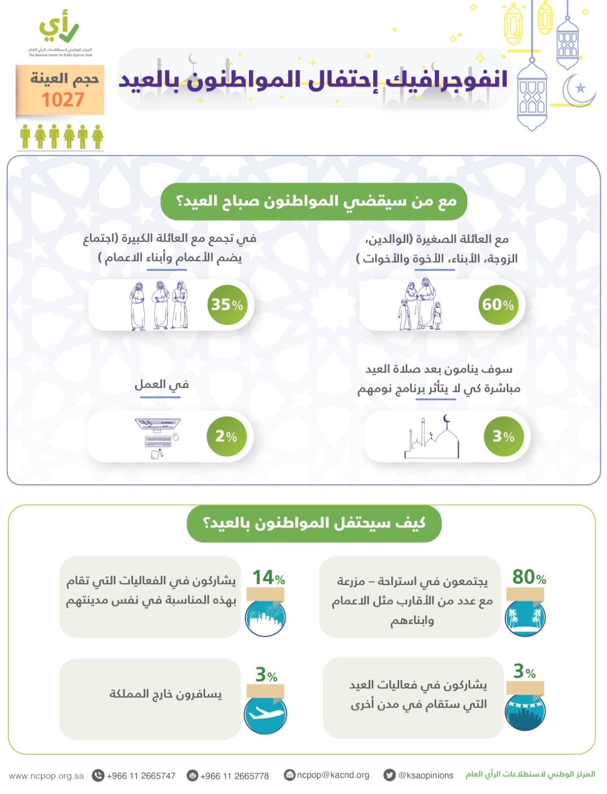 وفيما يخص كيف سيحتفل المواطنين بالعيد 80% يجتمعون في إستراحة - مزرعة مع عدد من الأقارب مثل الاعمام واولادهم و14% سيشاركون في الفعاليات التي تقام بهذه المناسبة في مدينتهم، و3% سيشاركون في فعالية العيد في مدن أخرى فيما يفضل 3% السفر خارج المملكة.