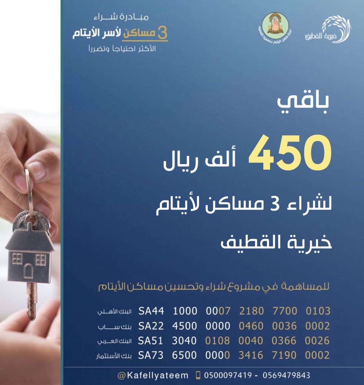 450 ألف ريال تفصل «خيرية القطيف» عن شراء 3 مساكن للأيتام