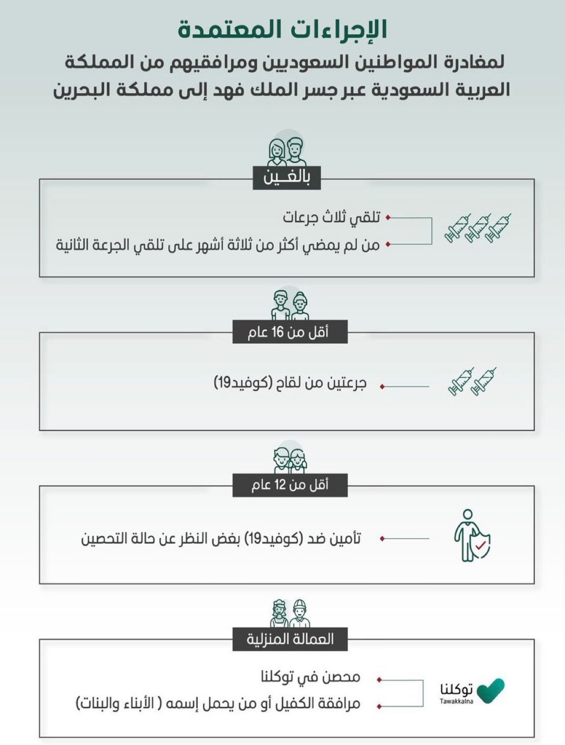 وقالت مؤسسة الملك فهد عبر موقع التواصل الاجتماعي“تويتر”، إنه على المسافرين ضرورة التحقق من توفر المتطلبات اللازمة والإجراءات المعتمدة لمغادرة المملكة ومرافقيهم عبر جسر الملك فهد إلى مملكة البحرين.