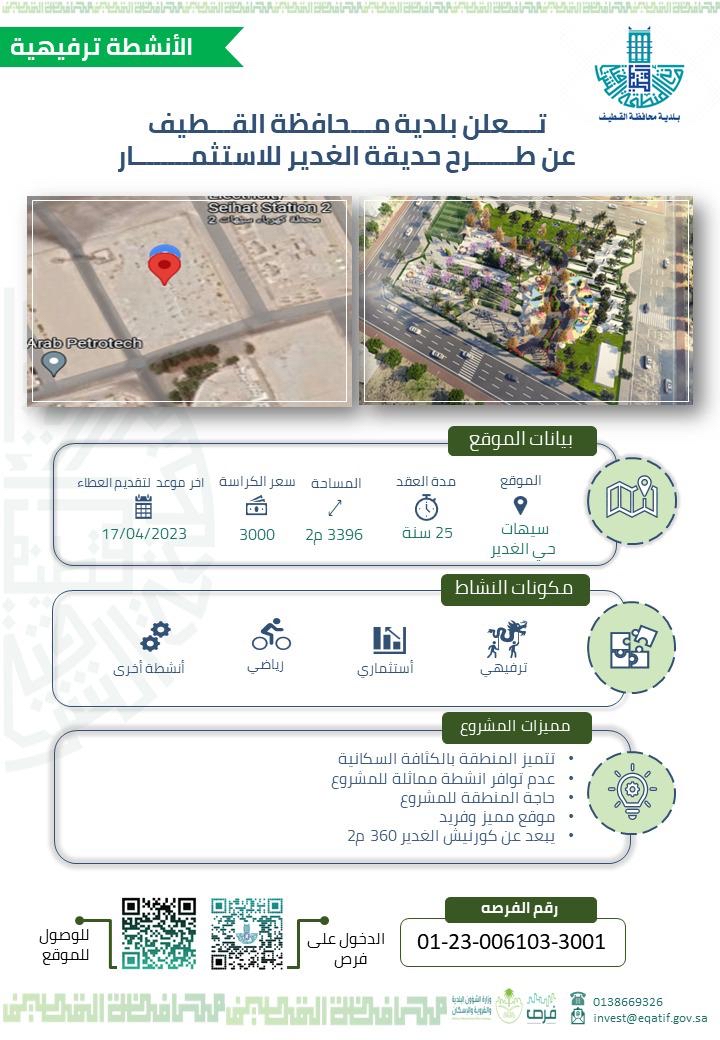 طرحت بلدية محافظة القطيف، فرص استثمارية لـ «حديقة منتزه سيهات العام، بمساحة 45000 ألف متر، وحديقة الغدير بمساحة 3396 ألف متر» والتي تعتبر حدائق قائمة ومكتملة الخدمات، وبعقود تمتد لـ 25 سنة.