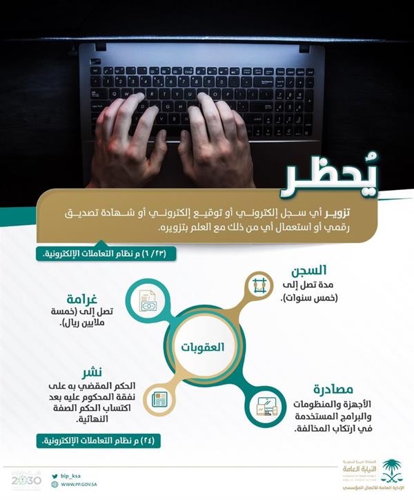 حددت النيابة العامة، العقوبات المُقررة نظاماً بحق كل من يقوم بتزوير أي سجل أو توقيع إلكتروني أو شهادة تصديق رقمي، أو استعمال هذه الوثائق مع العلم بتزويرها.