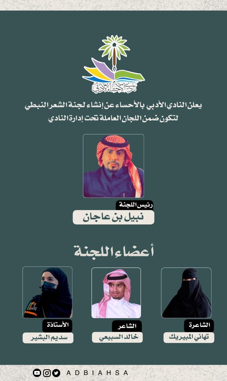 ويعد نادي الأحساء الأدبي هو أول ناد أدبي في المملكة يتبنى مثل هذه اللجنة ويكون الشعر النبطي ضمن اهتمامات النادي كونه من الفنون الأدبية الشعرية وله حضور كبير بين أبناء وبنات المجتمع السعودي، ويحمل قيما ومضامين وصورا شعرية خلّاقة.