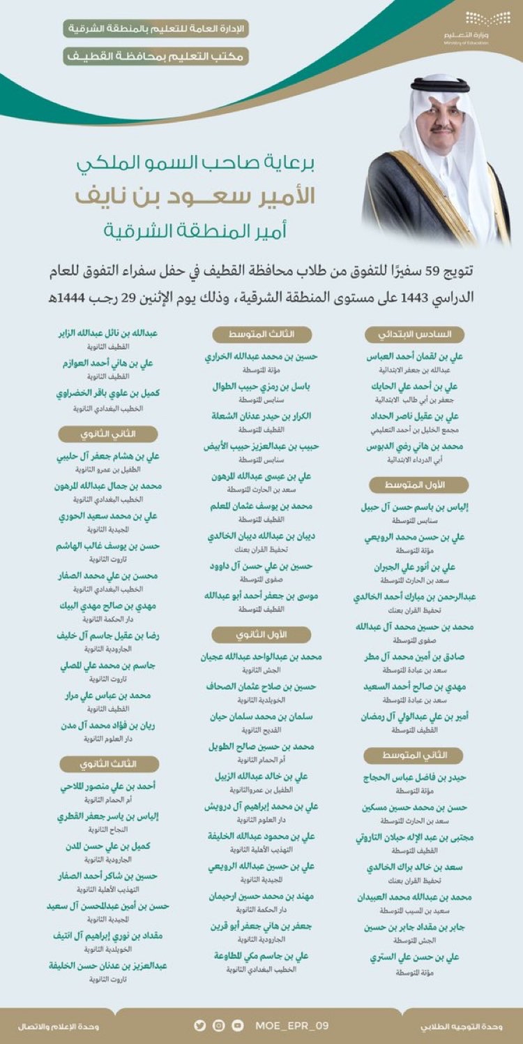 تُوج 59 سفيرًا للتفوق من طلاب مدارس محافظة القطيف في حفل سفراء التفوق للعام الدراسي 1443 على مستوى المنطقة الشرقية، اليوم الاثنين بمسرح أمانة المنطقة الشرقية بالدمام.