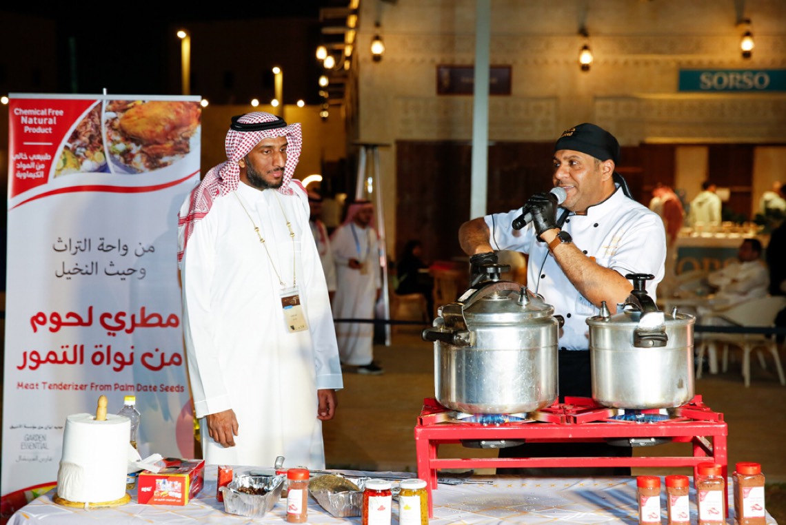 وأكد الإقبال على المنتج الجديد من التمور التحويلية»مُطرّي اللحوم«، الطبيعي أو ما يُعرف ب»بُهارات اللحوم«، والذي يُنتج من نواة التمر بعد طحنها، موضحًا أنه خالي من المواد الكيميائية، وأن ساحة الفعاليات شهدت تقديم هذا المنتج، واستخدامه في إعداد أطباق الكبسة.