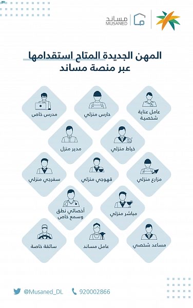 سمحت وزارة الموارد البشرية والتنمية الاجتماعية بالاستقدام لـ 10 مهن جديدة، وذلك عبر منصة «مساند» ضمن عمل الوزارة المستمر في تطوير قطاع العمالة المنزلية في المملكة.