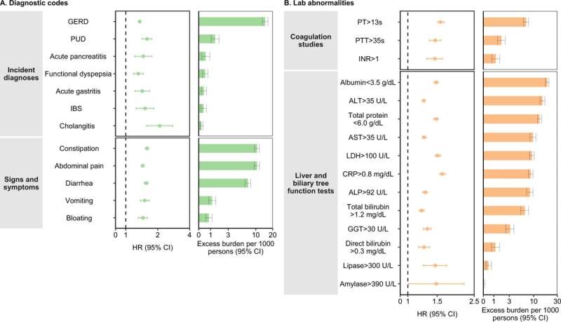 مقارنةً أيضًا بمجموعات التحكم، كان المرضى الذين أصيبوا بالفيروس أكثر عرضة بنسبة 54% للإصابة بمتلازمة القولون العصبي، و47% أكثر عرضة للإصابة بالتهاب بطانة المعدة، و36% أكثر عرضة للإصابة باضطراب في المعدة دون سبب واضح..