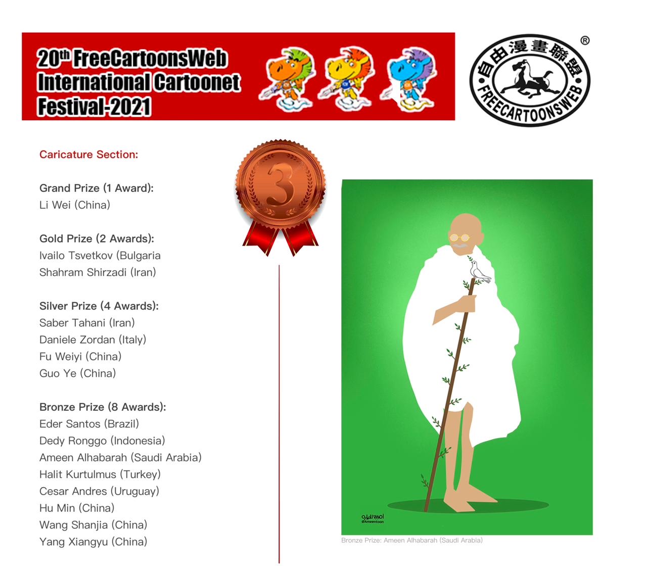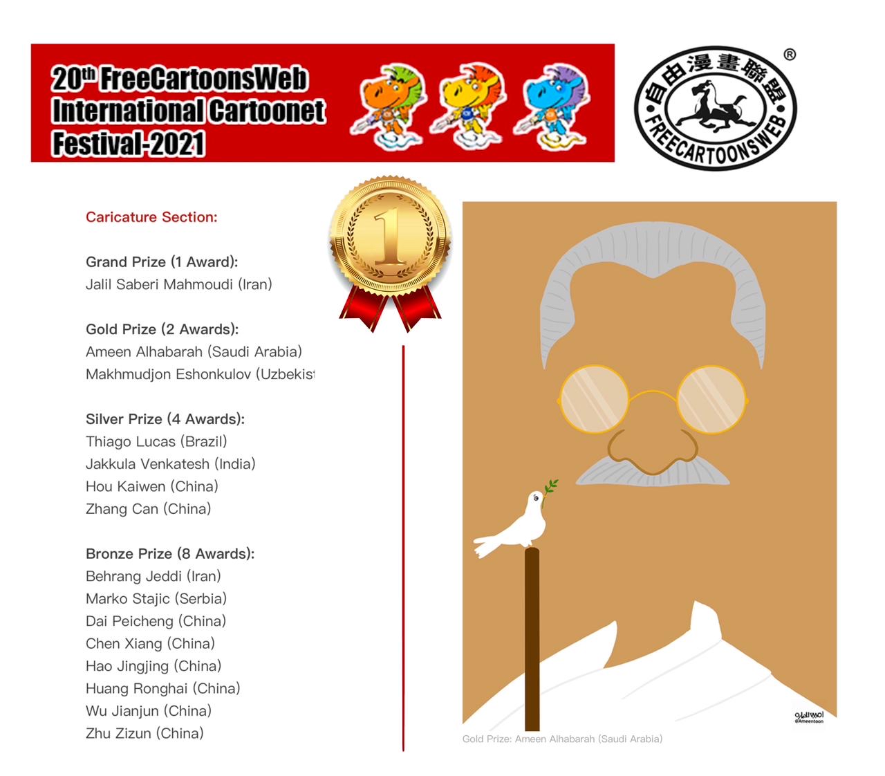 حصل رسام الكاريكاتير السعودي أمين الحباره على جائزتين الأولى ذهبية والثانية برونزية في مسابقة فري كارتونز ويب الدولية العشرين والواحدة والعشرين في الصين.