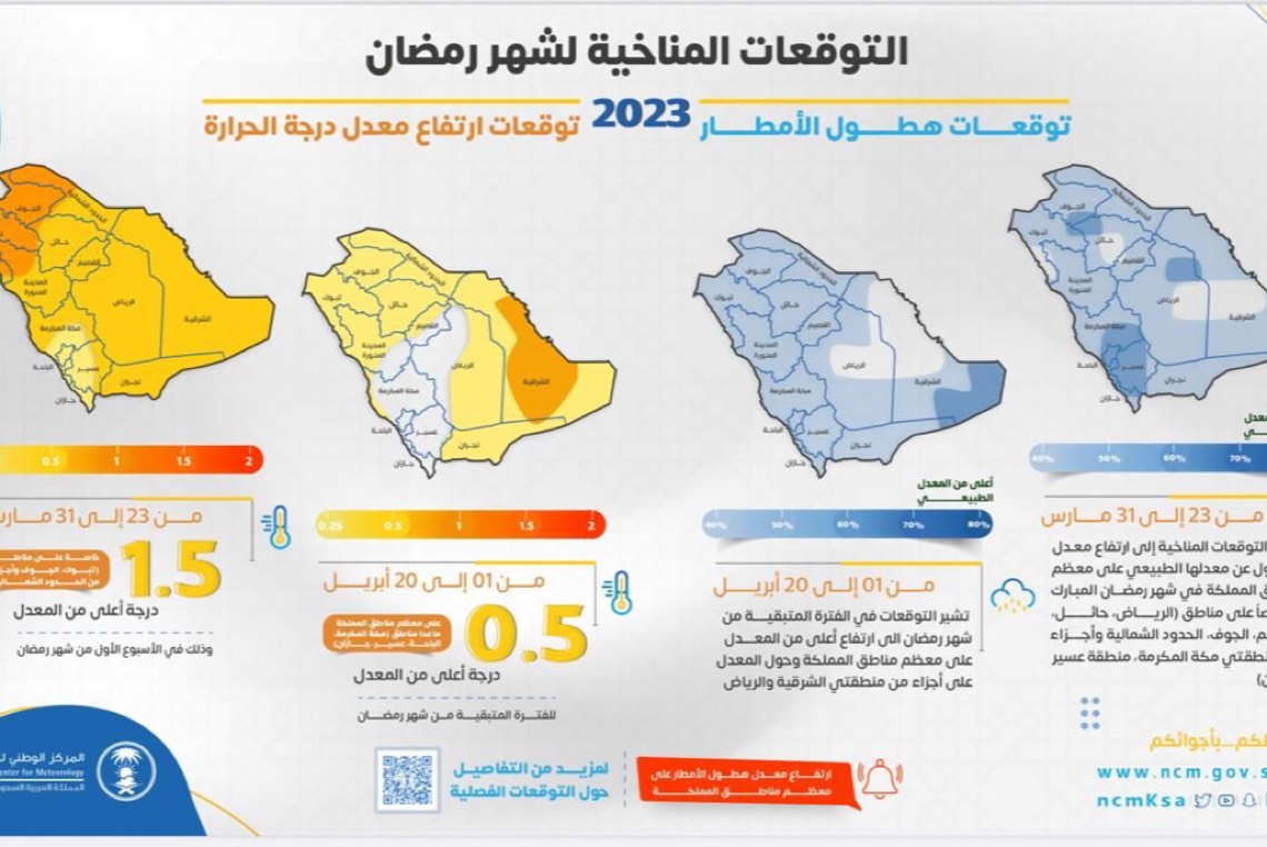 أصدر المركز الوطني للأرصاد تقريره الخاص بالملامح المناخية لشهر رمضان المبارك خلال الفترة من 23 مارس إلى 20 أبريل 2023م، حيث تقع هذه الفترة خلال فصل الربيع أرصاديًا.