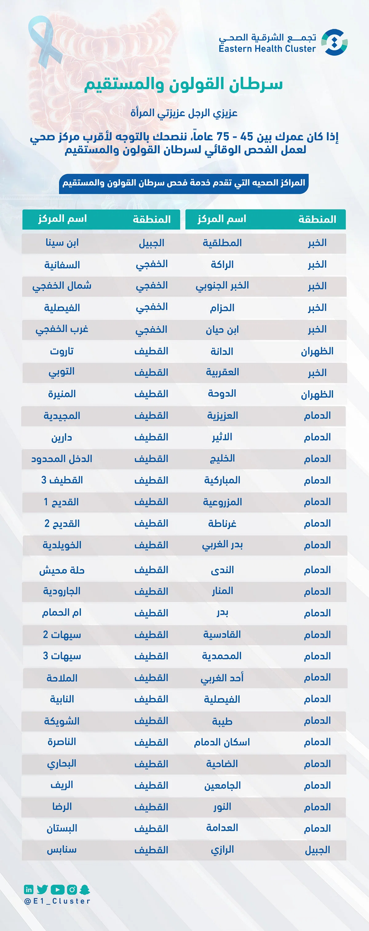 ونصح التجمع بأنه إذا كان عمر الشخص ما بين 45 - 75 عاماً بالتوجه لأقرب مركز صحي لعمل الفحص الوقائي لسرطان القولون والمستقيم.