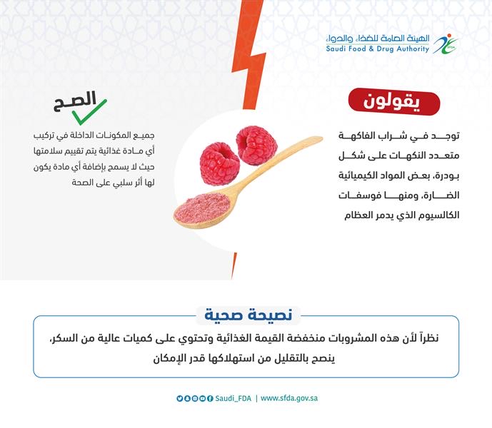 نفت الهيئة العامة للغذاء والدواء صحة ما يُتداول بأن شراب الفاكهة متعدد النكهات على شكل بودرة يحتوي على مواد كيميائية ضارة.