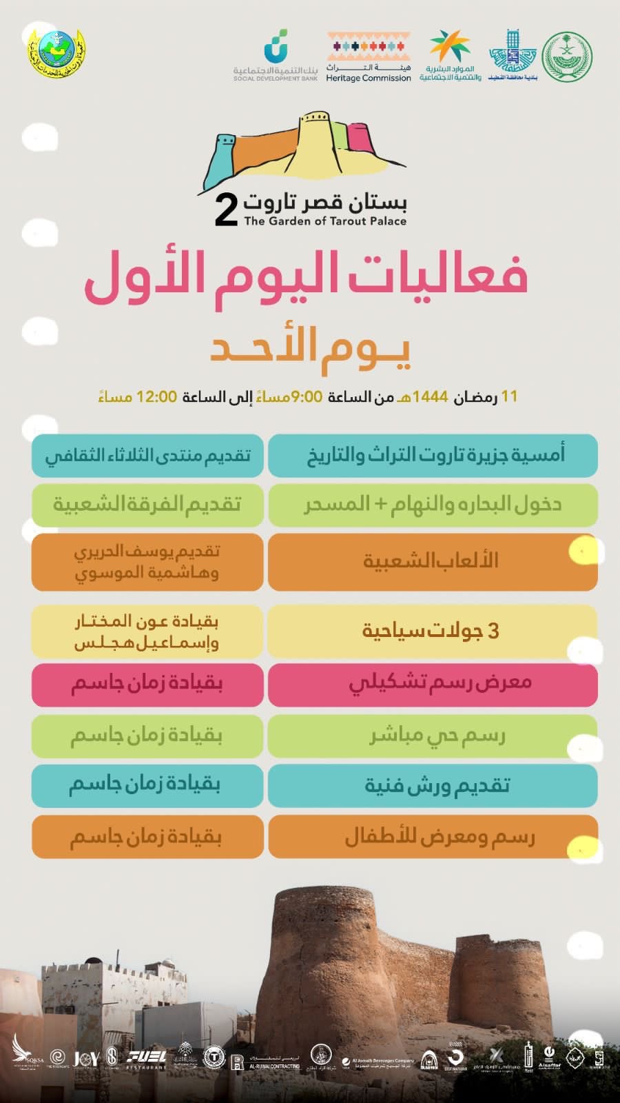 وتشتمل الفعاليات التي تستقبل الزوار يوميًا من الساعة 9 مساءً حتى 12 مساءً، مسارًا سياحيًا عبر رحلة مشوقة في عبق التاريخ بين القصر الأثري لتاروت، والحي التاريخي، للتعرف على جانب من تاريخ وتراث وحضارة هذه الجزيرة الموغلة في القدم.