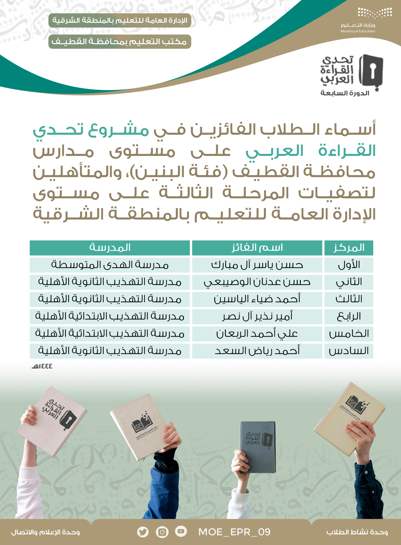 حصد طلاب مدرسة التهذيب الثانوية الأهلية 5 مراكز متقدمة في مسابقة مشروع تحدي القراءة العربي على مستوى مدارس القطيف «فئة البنين»، وفقا لما أعلنه مكتب تعليم القطيف.