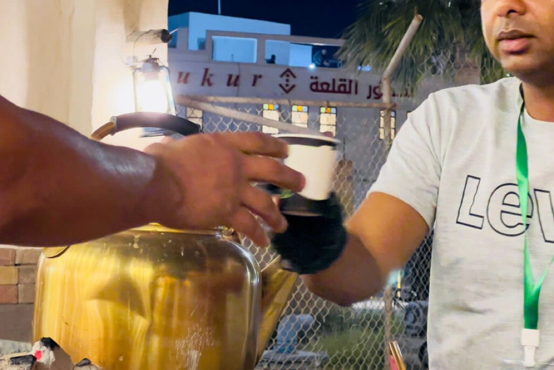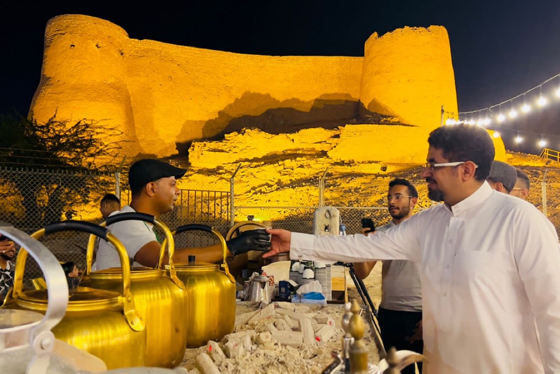 جذب مُقدم الضيافة في مبادرة «بستان قصر تاروت» راكان آل شوكان، انتباه الحضور، بترحيبه الحار بالضيوف، حيث يخدم أكثر من 10 آلاف من الزوار، يسقيهم الشاي والكرك والدارسين والنعناع والليمون والزنجبيل.
