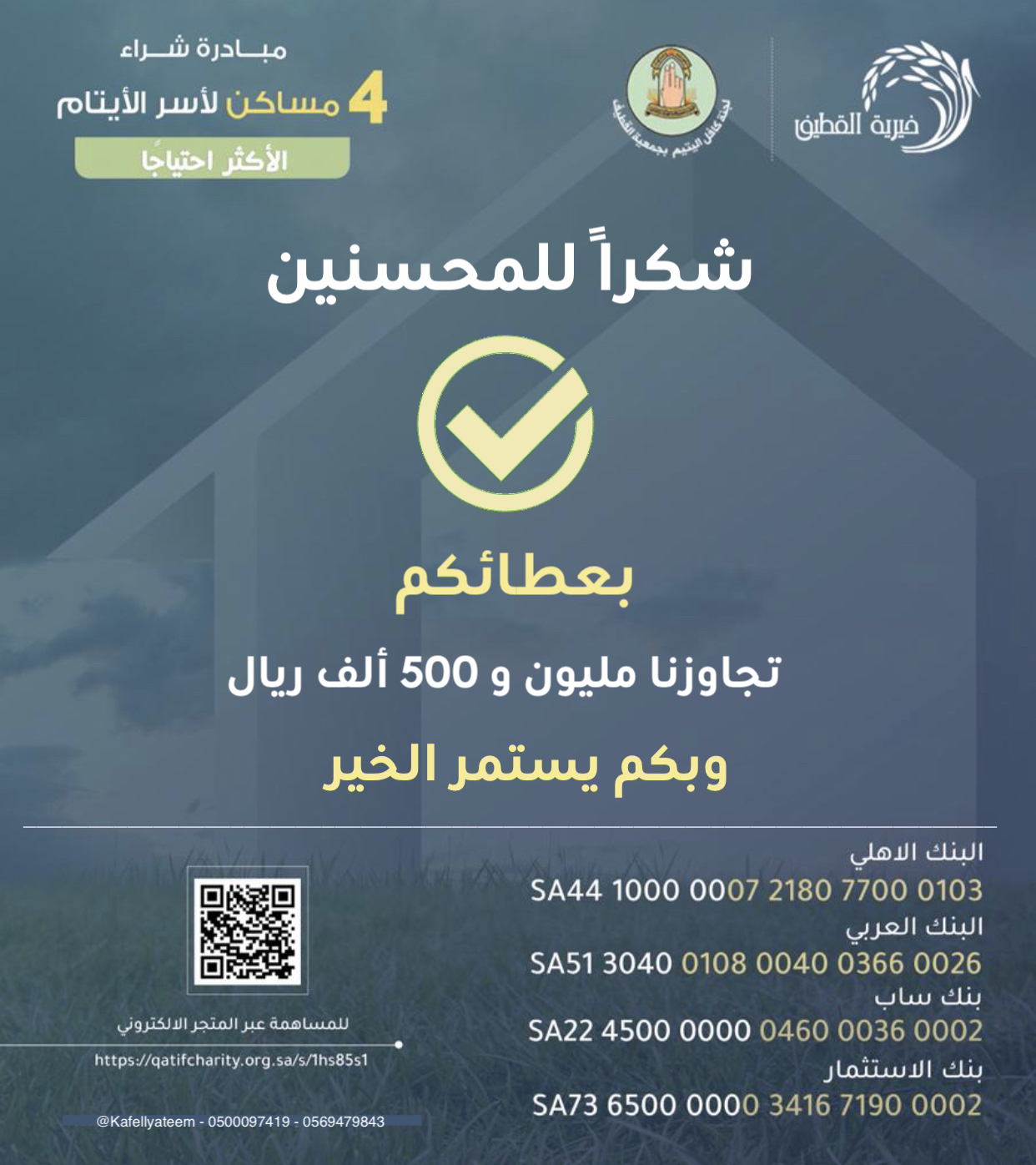 ويمكن دعم مشروع تحسين مساكن الأيتام من خلال مكاتب خيرية القطيف، أو الإيداع المباشر في حسابات لجنة كافل اليتيم الموجودة في الإعلان، أو عبر المتجر الإلكتروني.