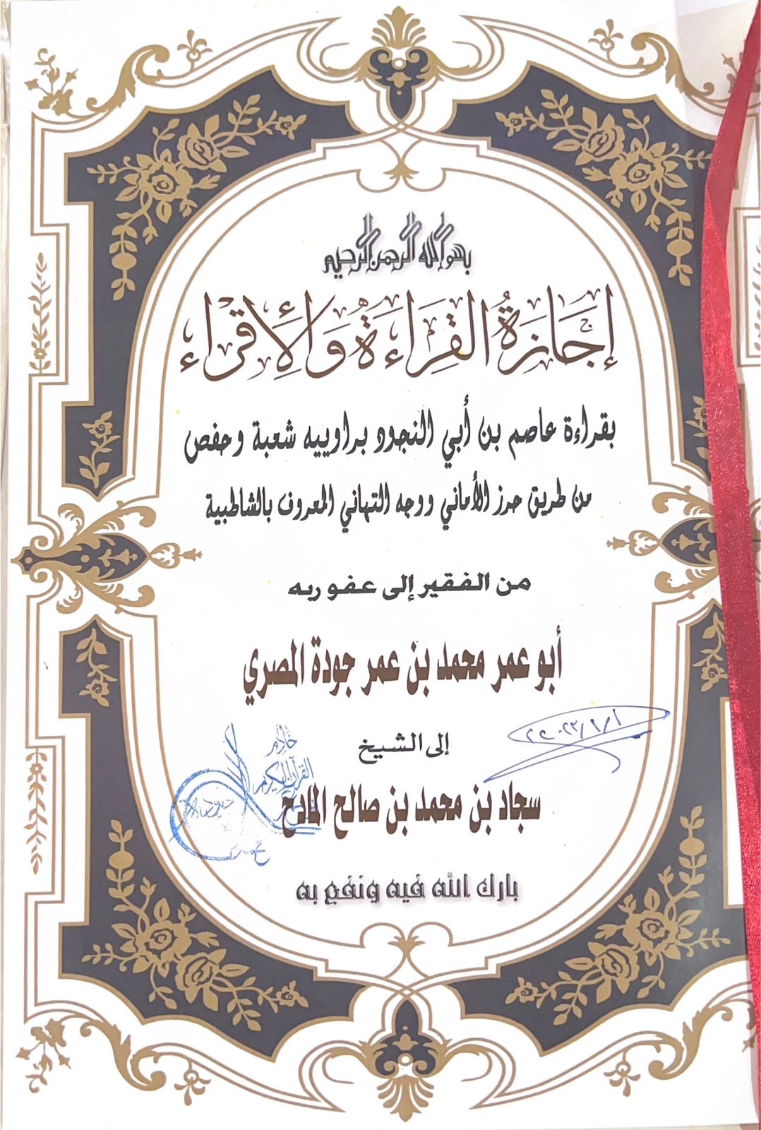 أجاز الشيخ محمد عمر جودة المعلم بجمعية الدوادمي لتحفيظ القرآن الكريم الحافظ سجاد المادح براوييه شعبة وحفص.