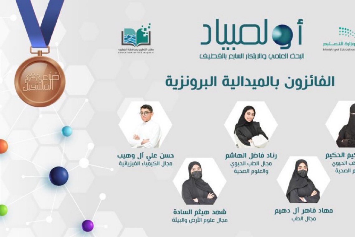 فاز 15 طلاب وطالبات بميداليات ذهبية وفضية وبرونزية في أولمبياد البحث العلمي والابتكار السابع بالقطيف 2023، والذي نظمه مكتب تعليم القطيف خلال المدة 18-20 شوال 1444 هـ.