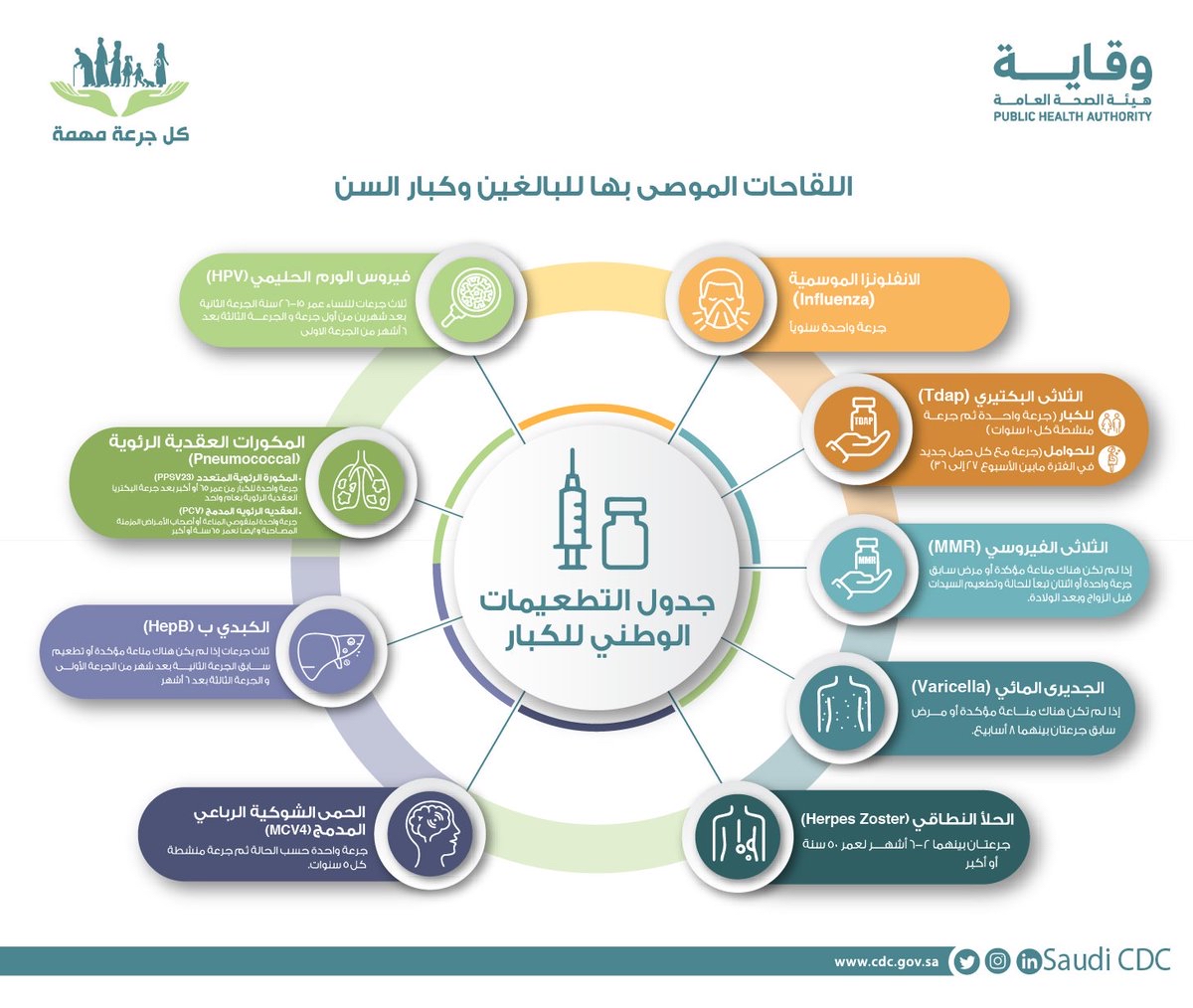 ويتضمن جدول التطعيمات تطعيم ”المكورات العقدية الرئوية“ ويشمل المكورات الرئوية المتعددة والمكورات الرئوية المدمجة لمرضى المناعة والأمراض المزمنة.