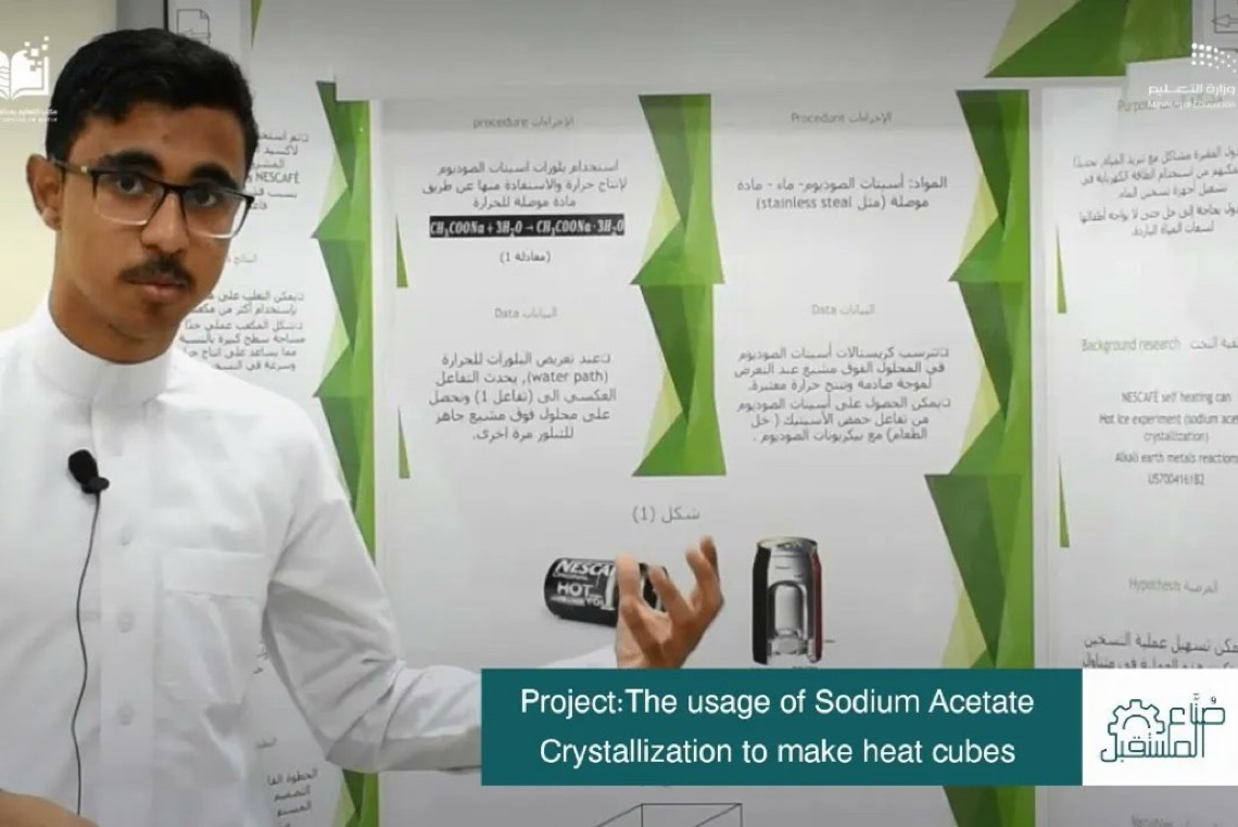 استعرض الطالب ”محمد كريكيش“، من مدرسة القطيف الثانوية، مشروعه في مجال الكيمياء - تحت عنوان ”استخدام تبلور خلات الصوديوم لعمل مكعبات حرارية“.