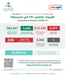 أعلنت وزارة الصحة إحصائية جديدة لمستجدات كورونا في المملكة خلال ال 24 ساعة الماضية تضمنت تسجيل ”5477“ حالة مؤكدة. ”54“ في القطيف و”14“ بصفوى. وبينت الإحصائية أن إجمالي عدد الإصابات في المملكة بلغ ”615430“ حالة. كما أعلنت الصحة عن تسجيل ”3405“ حالة تماثلت للشفاء، ليصل مجموع المتعافين إلى ”564947“ حالة تعافي، فيما ارتفع إجمالي الوفيات في المملكة إلى ”8906“ حالة بعد تسجيل ”1“ حالة وفاة جديدة. وبلغ إجمالي الحالات النشطة ”37,223“ حالة، منها ”336“... |