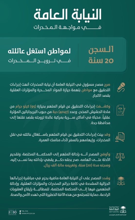 النيابة العامة: السجن 20 عاماً لمواطن استغل عائلته في ترويج المخدرات