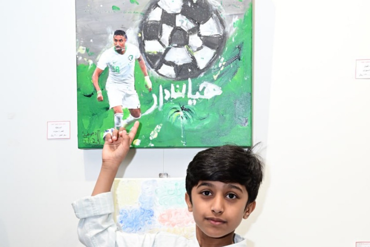 الفنان الواعد آدم والذي أصبح الفن كالظل له طيلة ست سنوات شارك مؤخرًا في معرض ”المواهب الصغيرة“ السادس، بلوحة حملت اسم ”كرة القدم وسالم الدوسري“.