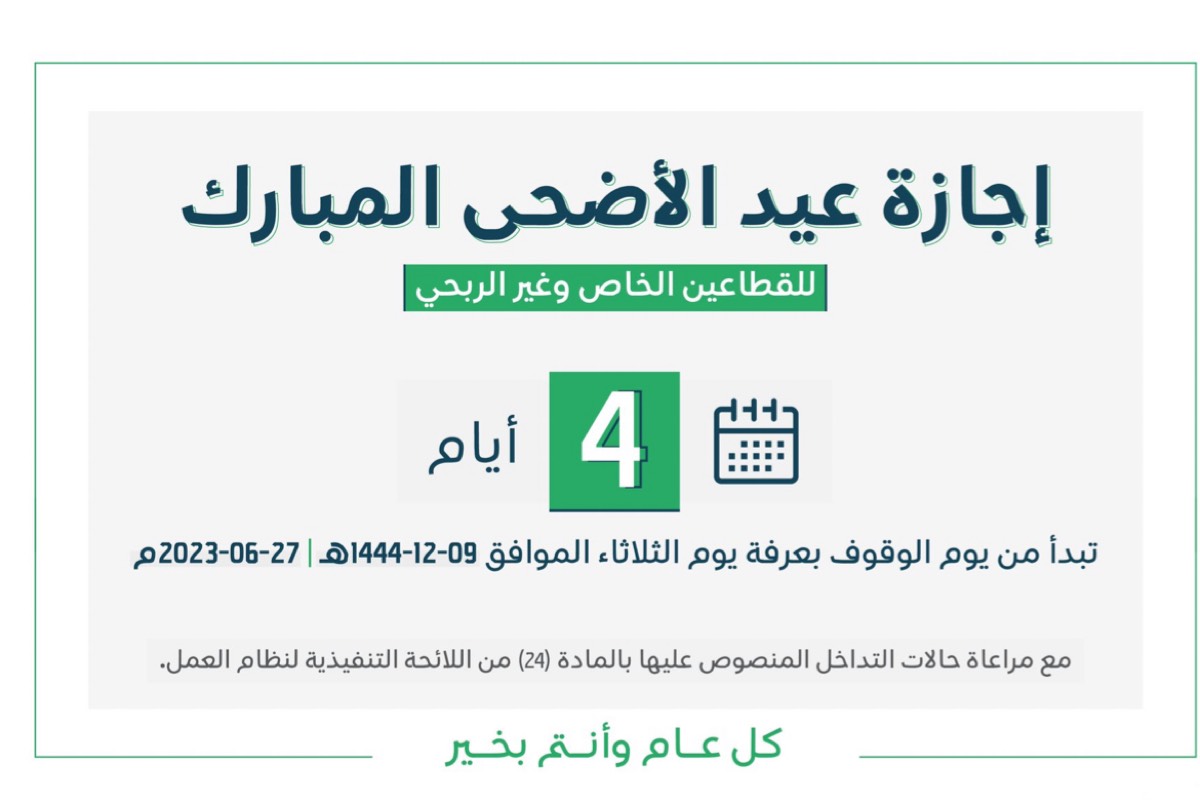 وذكرت وزارة الموارد لبشرية «عبر حسابها بموقع تويتر»، أن إجازة عيد الأضحى للقطاعين الخاص وغير الربحي ستكون لمدة «4» أيام.