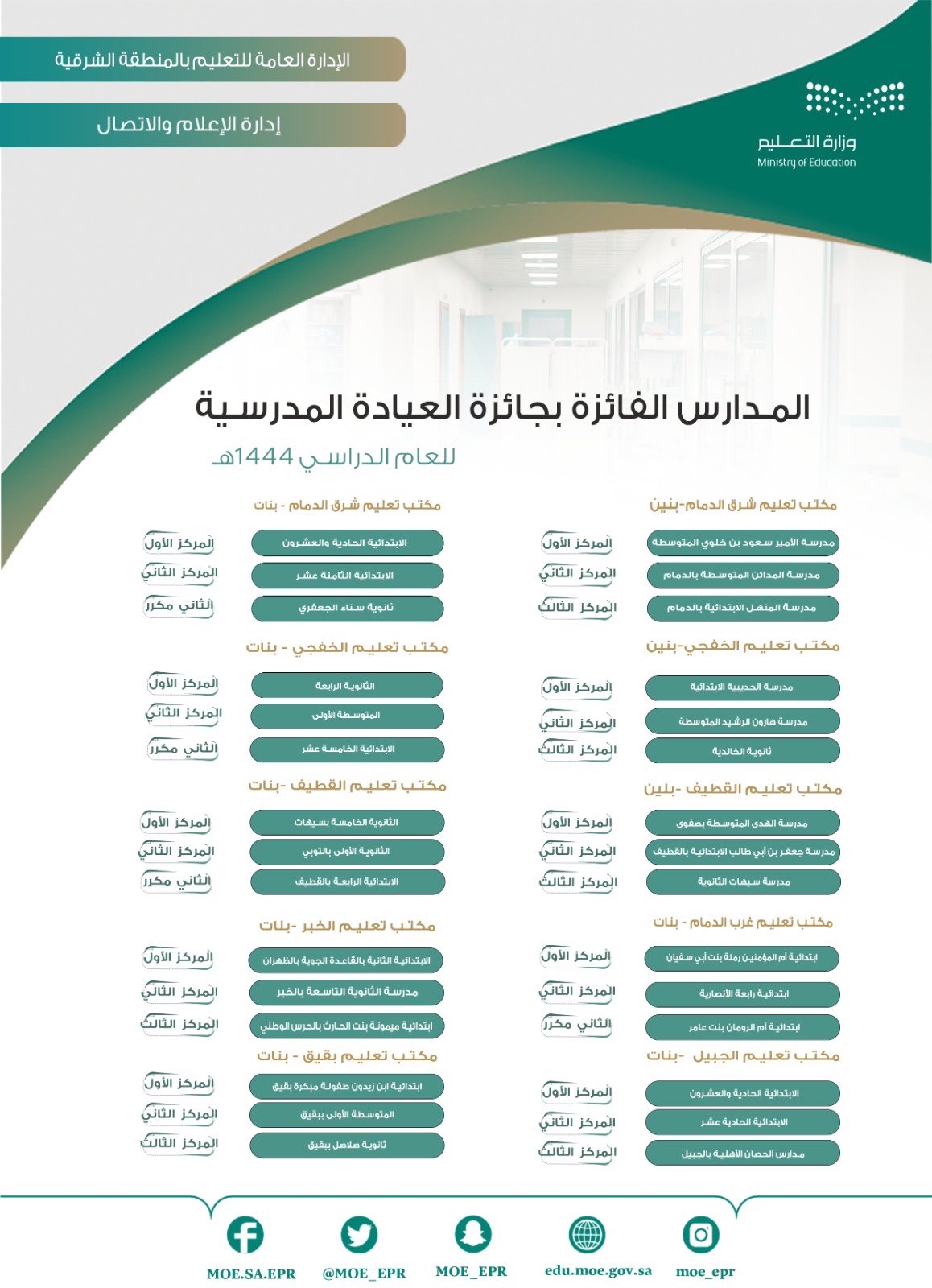 أعلنت إدارة الشؤون الصحية المدرسية بتعليم الشرقية عن أسماء 30 مدرسة فائزة بجائزة ”العيادة المدرسية“ للعام الدراسي 1444ه، من بينها 6 مدارس بالقطيف.