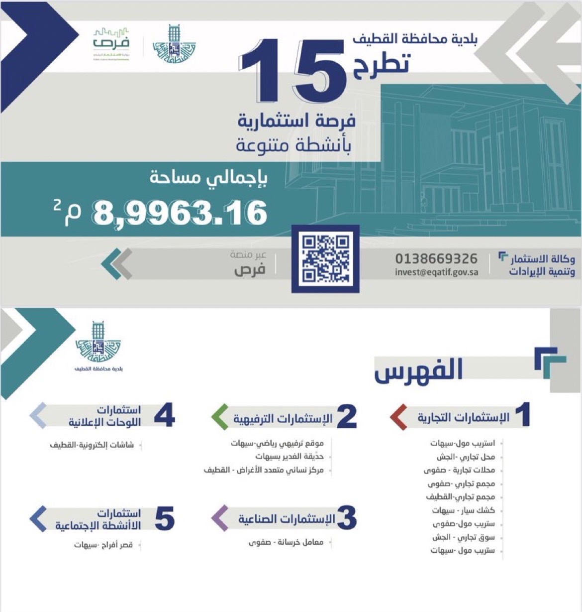 طرحت بلدية محافظة القطيف، 15 فرصة استثمارية متنوعة، بإجمالي مساحة 8,9963.16 متر مربع، تتمثل في استثمارات تجارية وترفيهية ورقمية، وصناعية واجتماعية وإعلانية.
