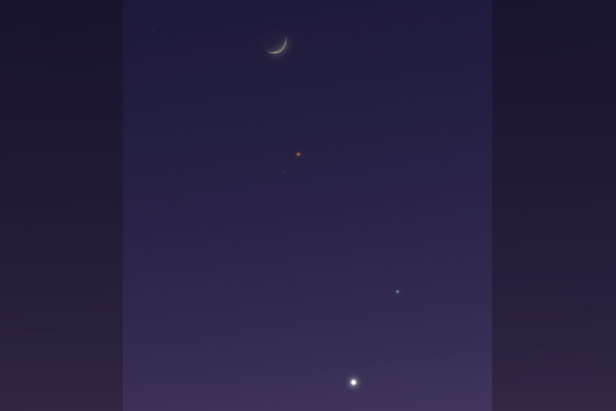 وأوضح أنه يفضل البدء في مراقبة السماء قبل حلول ظلمة الليل حيث سيكون هلال القمر أول الحاضرين ثم كوكب الزهرة ساطعاً نابضاً بالحياة ومشرقاً للغاية وعند رصده عبر تلسكوب صغير سيدو مثل الهلال في الوقت الحالي.