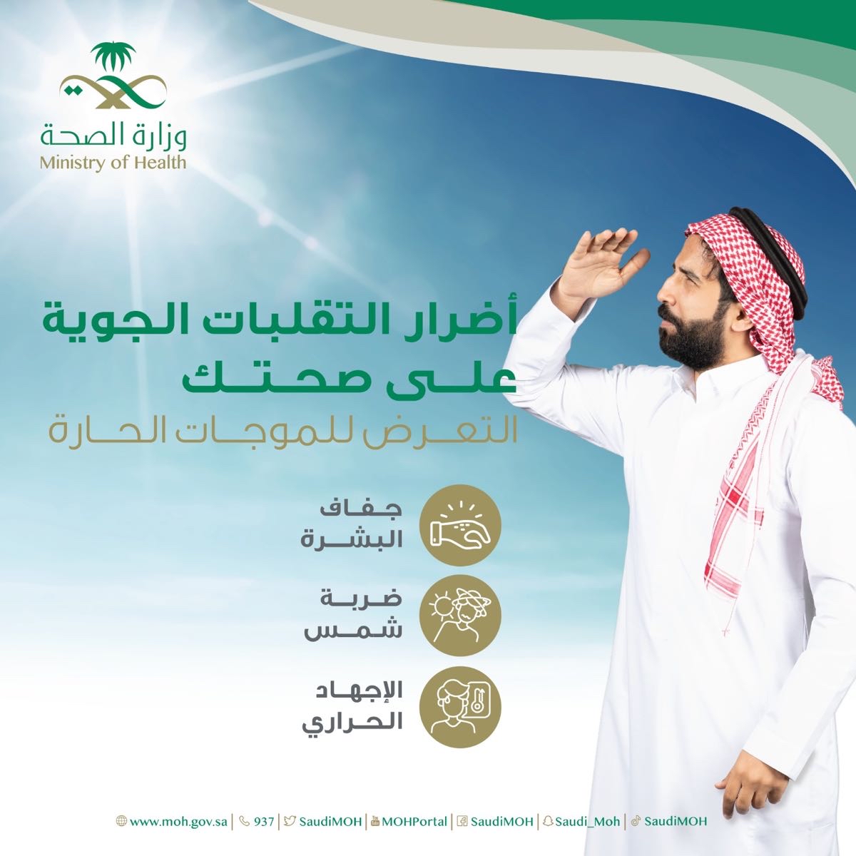 حذرت ”الصحة“ من التعرض لموجات الحر الشديدة التي تسيطر على معظم مناطق المملكة خلال موسم الصيف، وتسبب أضراراً على صحة الإنسان.