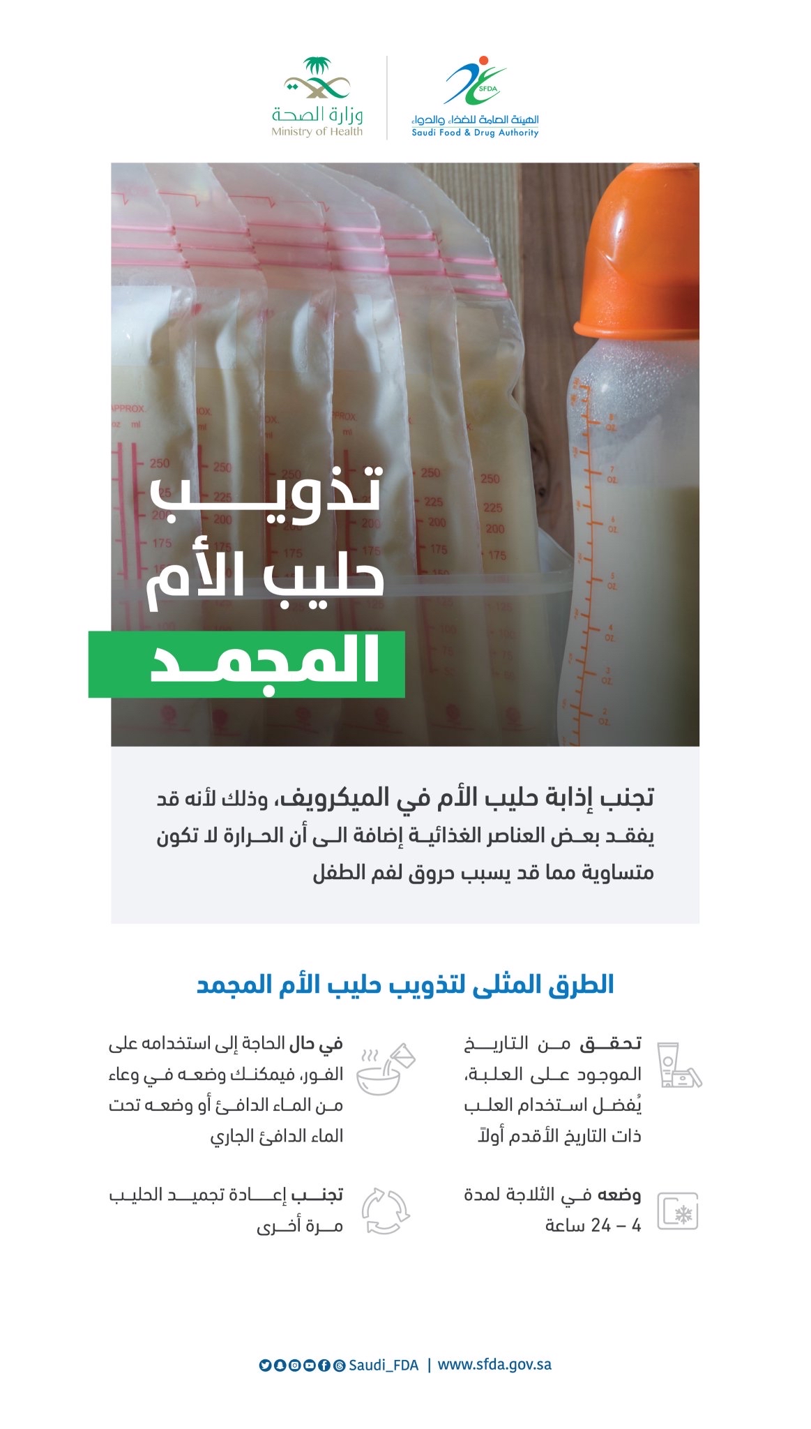 وشددت الهيئة على ضرورة اتباع طرق تذويب الحليب المجمد بشكل صحيح لضمان سلامته وسلامة الطفل.