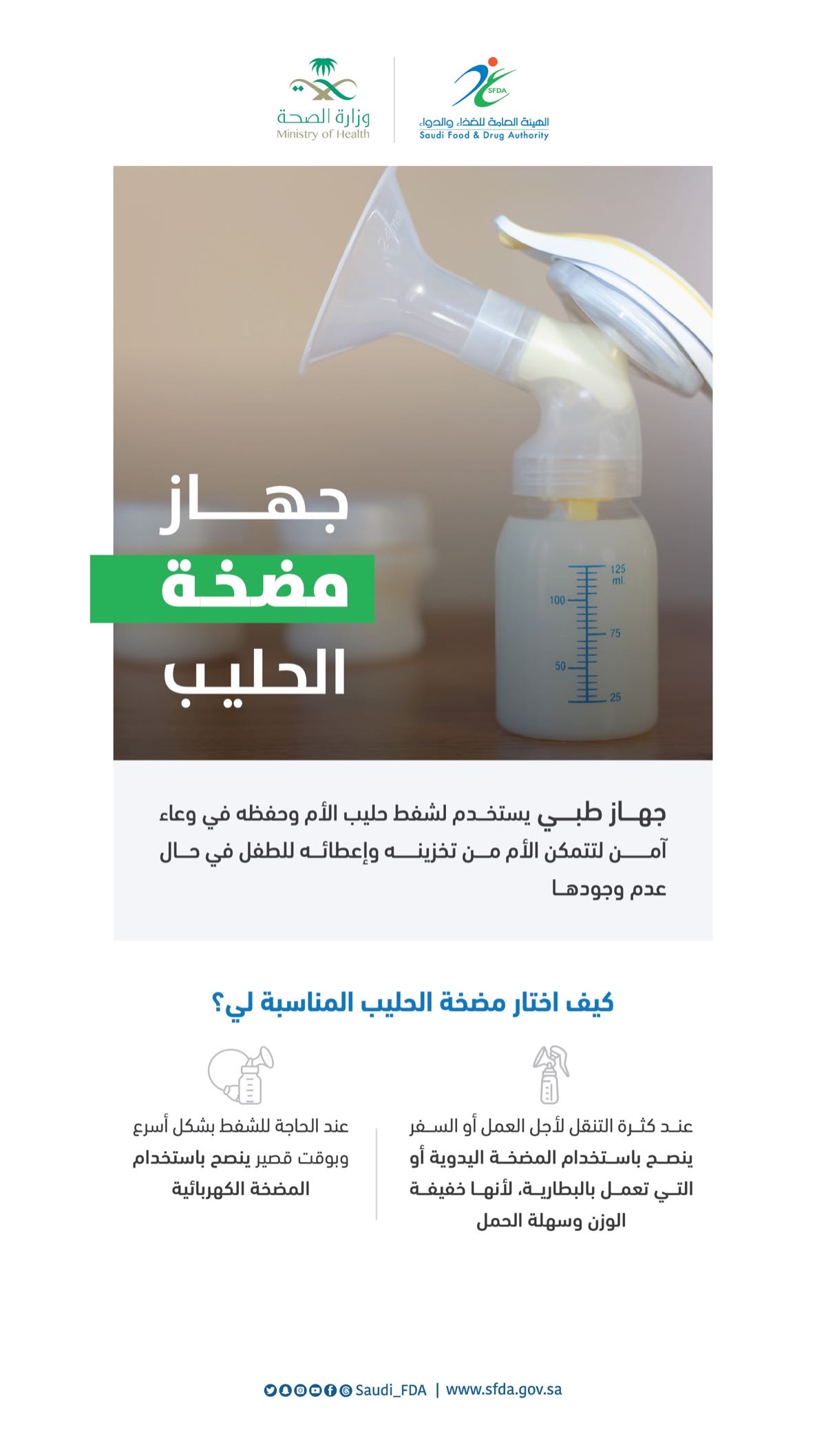 أوصت الهيئة العامة للغذاء والدواء بأهمية اتباع الضوابط والاحتياطات عند اختيار واستخدام أجهزة مضخات حليب الأم، وذلك في توجيه هام للأمهات.