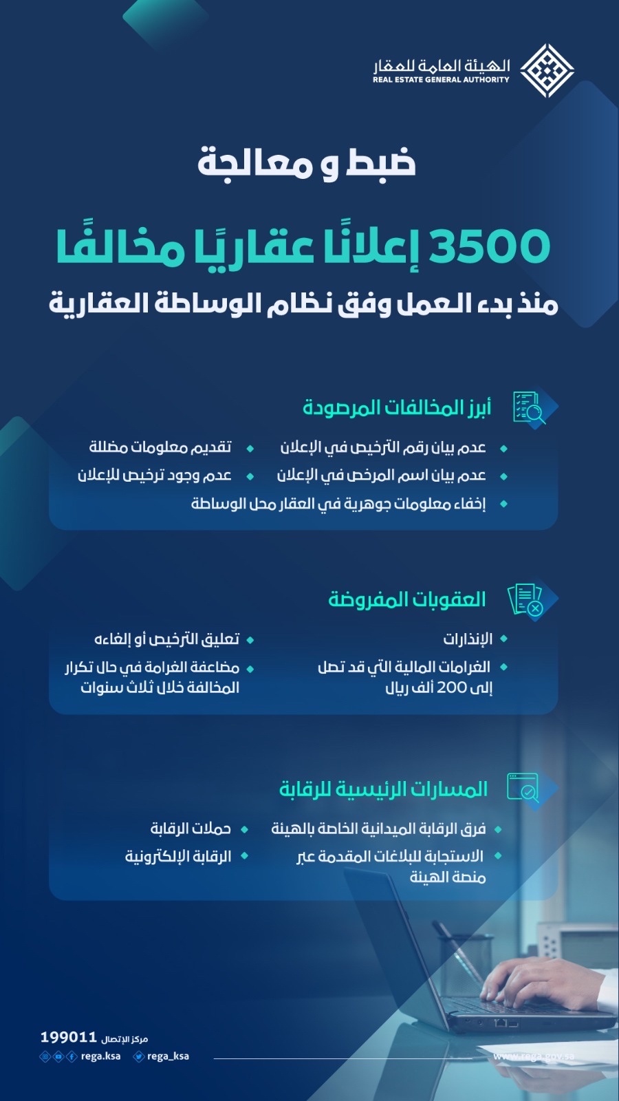 يأتي ذلك بعد أن ضبطت الهيئة «3500» إعلانًا عقاريًا مخالفًا، إضافةً إلى تلقيها «2057» بلاغًا، وذلك منذ بدء العمل وفق نظام الوساطة العقارية.