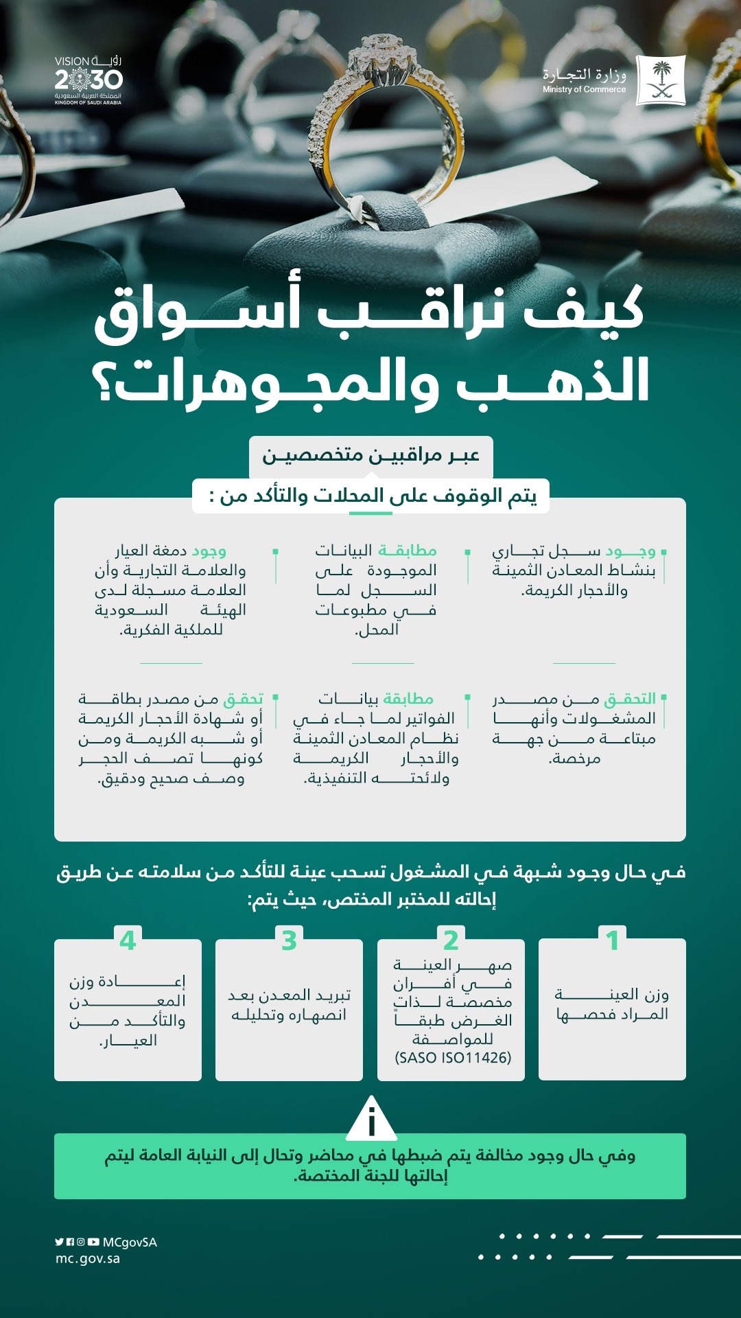 حددت وزارة التجارة طرق مراقبة الذهب والمجوهرات في أسواق المملكة أبرزها فحص درجة نقاء وعيار الذهب، والتحقّق من صحة الدمغة وسلامة الأحجار، وسحب العيّنات وفحصها في المختبرات، لكشف الغش.
