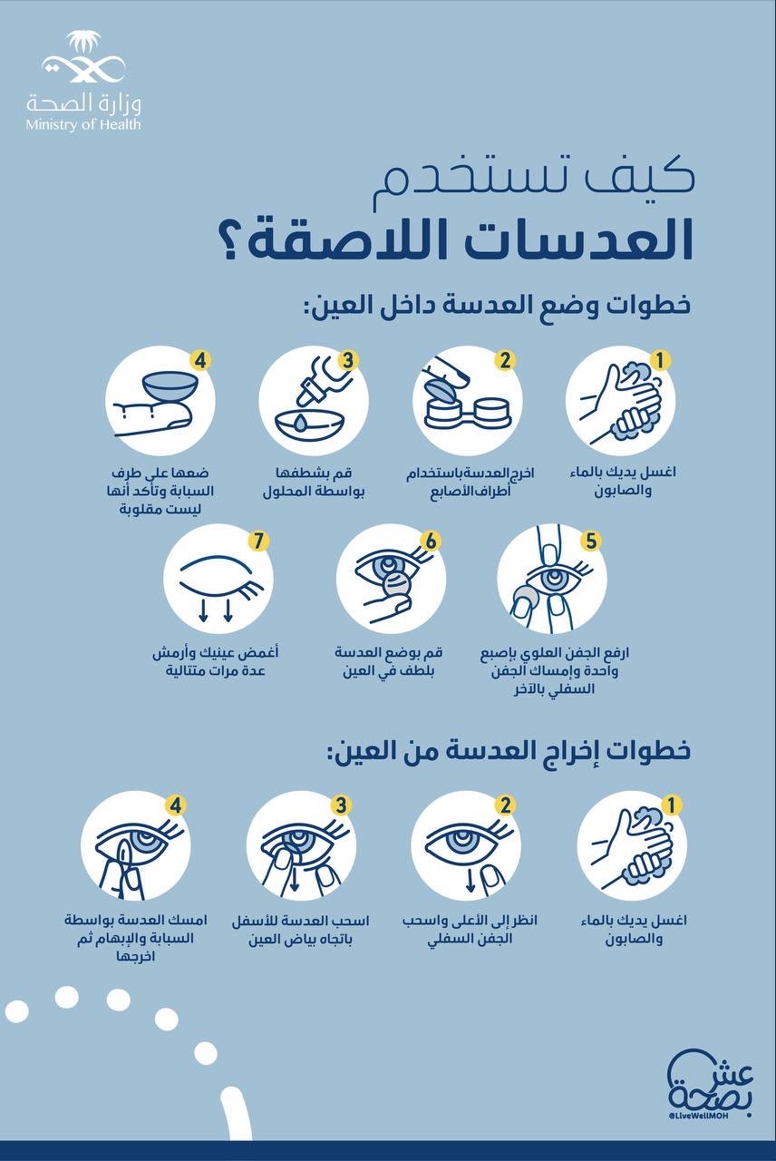 أوضحت الوزارة أن الخطوة الأولى تتطلب غسل اليدين جيدًا بالماء والصابون قبل البدء في التعامل مع العدسات اللاصقة.
