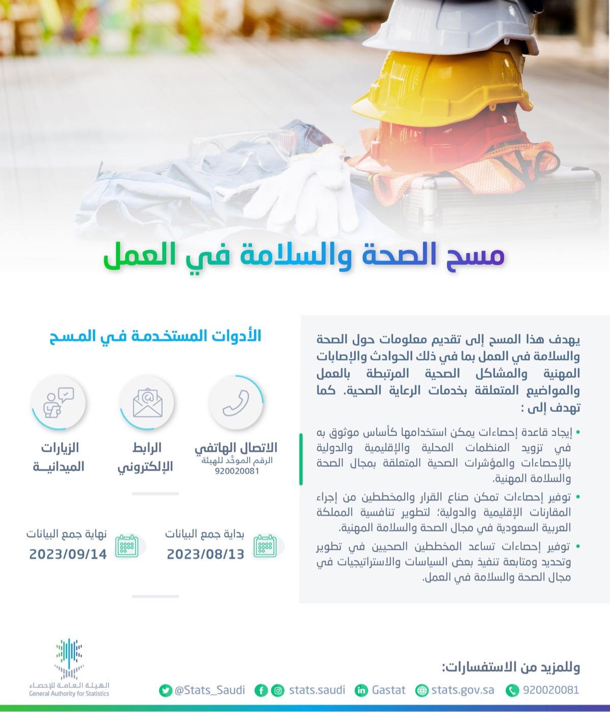 أعلنت الهيئة العامة للإحصاء عن إطلاق مسح شامل في مجال الصحة والسلامة في العمل، بهدف تطوير التنافسية المهنية للمملكة العربية السعودية.
