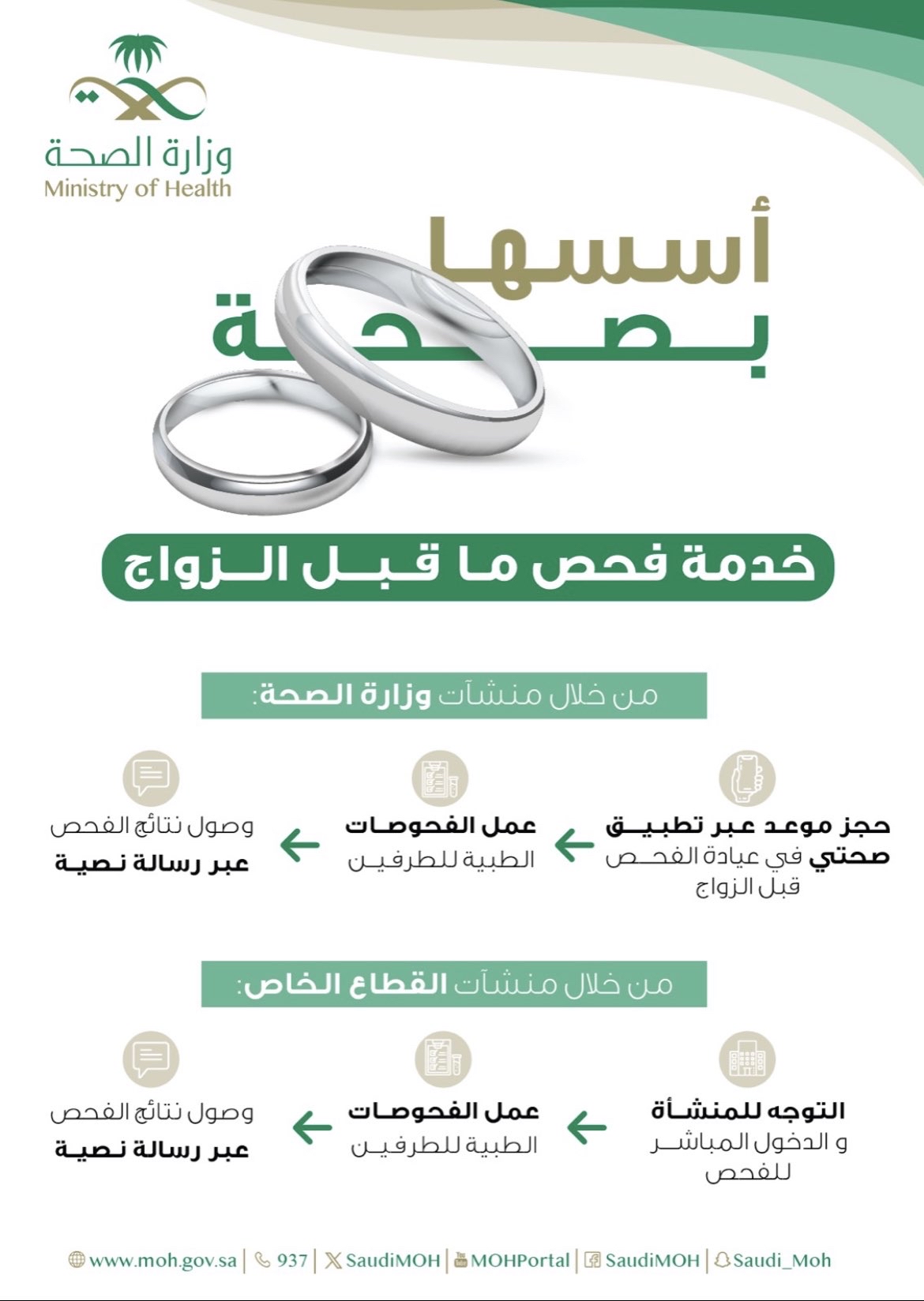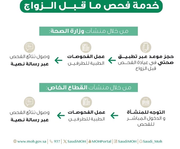 أعلنت وزارة الصحة عن طرق حجز فحص ما قبل الزواج في المنشآت التابعة لها من خلال تطبيق صحتي الإلكتروني.