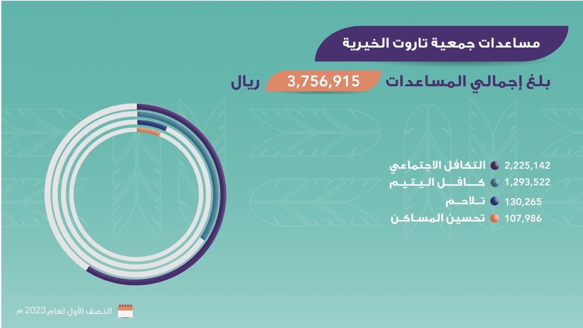 بلغ مجموع المساعدات التي قدمتها جمعية تاروت الخيرية، خلال النصف الأول من عام 2023 م، بلغت 3,756,915 ريالًا.