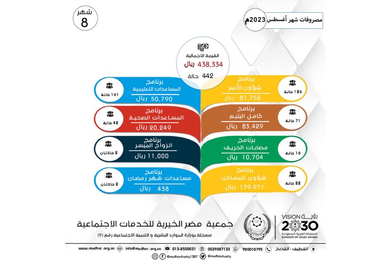 440 ألف ريال.. مصروفات «خيرية مضر» في أغسطس
