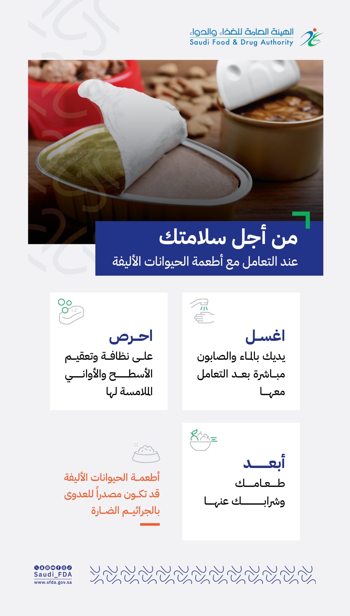 وقالت الهيئة: لإسلامتك عند التعامل مع أطعمة الحيوانات الأليفة اغسل يديك بالماء والصابون مباشرة بعد التعامل معها، مع الحرص على نظافة وتعقيم الأسطح والأواني الملامسة لها وإبعادها عن الطعام والشراب الخاص بأفراد الأسرة؛ لأن أطعمة الحيوانات الأليفة قد تكون مصدرًا للعدوى بالجراثيم الضارة.