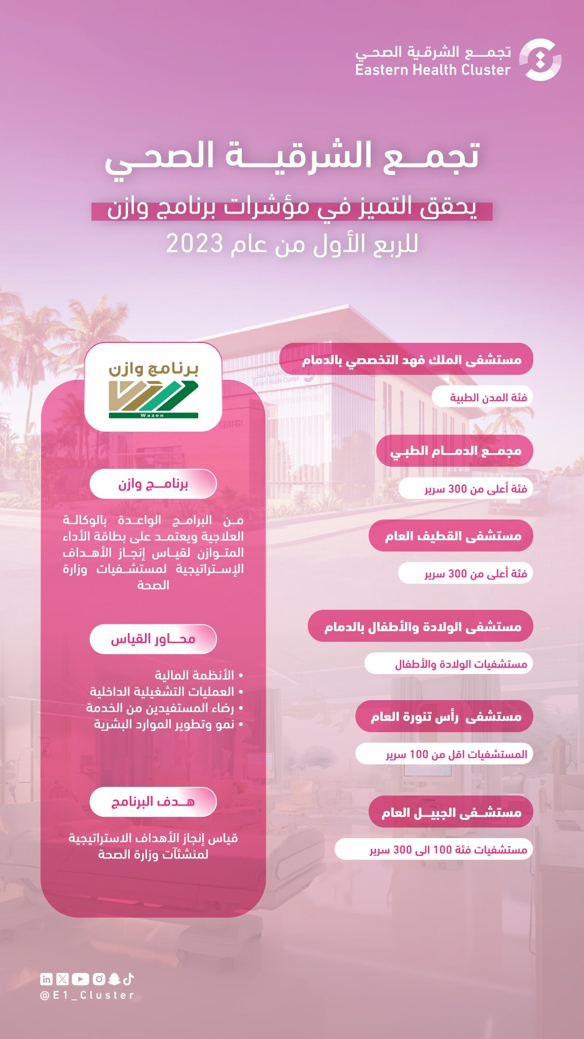 حققت مستشفيات تجمع الشرقية الصحي، مراكز متقدمة على مستوى المملكة، في مؤشرات برنامج وازن للربع الأول لعام 2023 م.