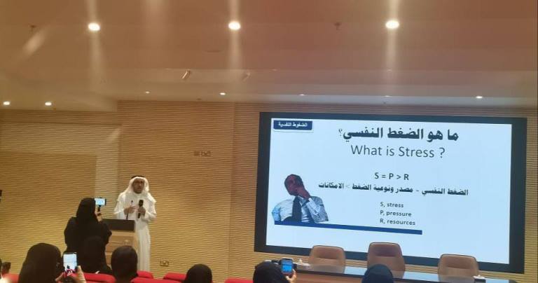 وبادرت الجمعية بتقديم محاضرة تثقيفية حول ”إدارة الضغوط النفسية“ ألقاها الأخصاي نفسي أول صالح البراك.
