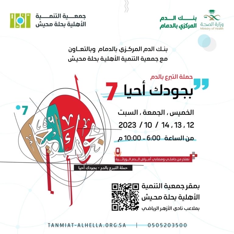 ينظم بنك الدم المركزي بالدمام حملة التبرع بالدم تحت شعار ”بجودك أحيا 7“ بالتعاون المشترك مع جمعية التنمية الأهلية في حلة محيش.