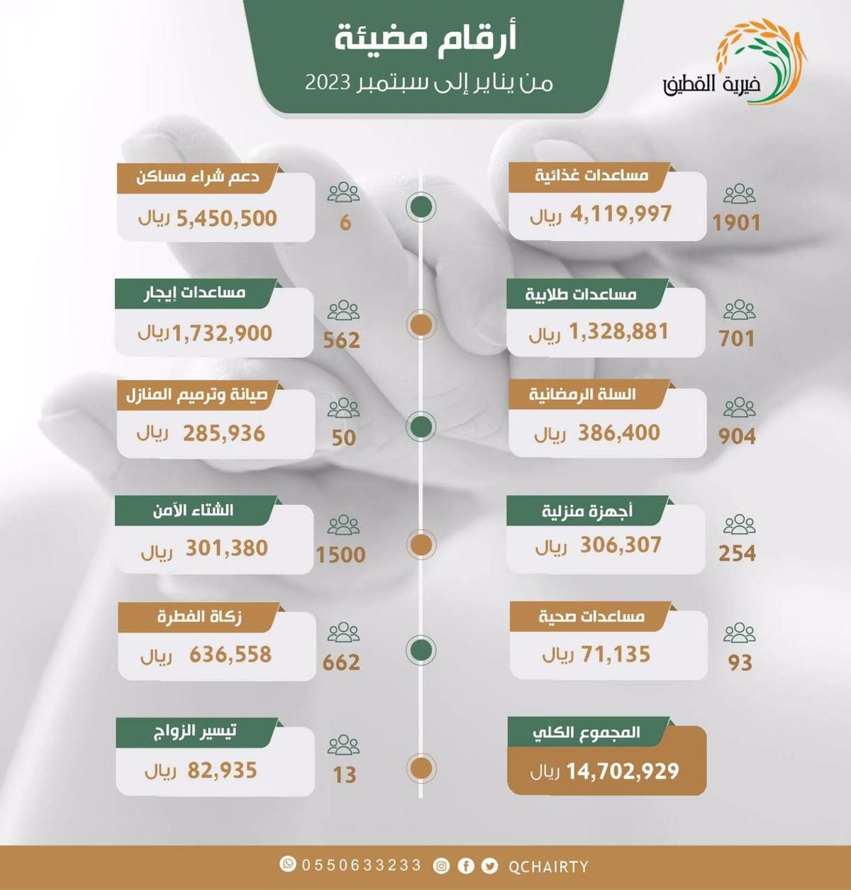 يذكر أن مساعدات جمعية القطيف الخيرية خلال النصف الأول من العام الحالي قد بلغت 10 ملايين ريال ليكون مجموع المساعدات خلال التسعة أشهر الماضية حوالي 14 مليون و700 الف ريال.