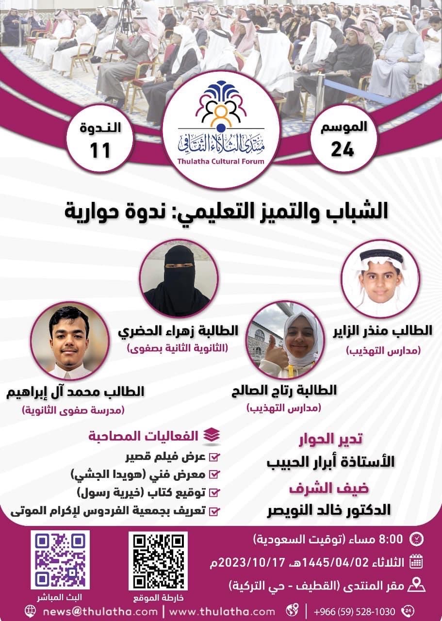 يستضيف منتدى الثلاثاء الثقافي، مساء الثلاثاء القادم، لقاءً حواريًا شبابيًا حول ”الشباب والتميز التعليمي“، بمشاركة أربعة من الطلبة المتميزين في المملكة العربية السعودية.