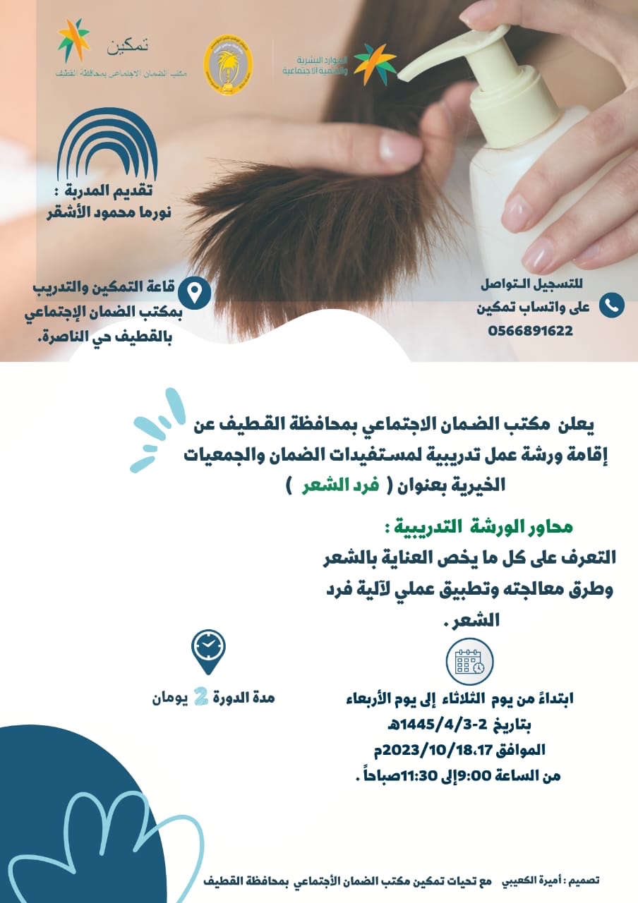 دعت إدارة مكتب الضمان الاجتماعي بمحافظة القطيف، المستفيدات، ومستفيدات الجمعيات الخيرية، بالمبادرة والتسجيل بورشة العمل، التي سيقيمها المكتب بعنوان ”فرد الشعر“.