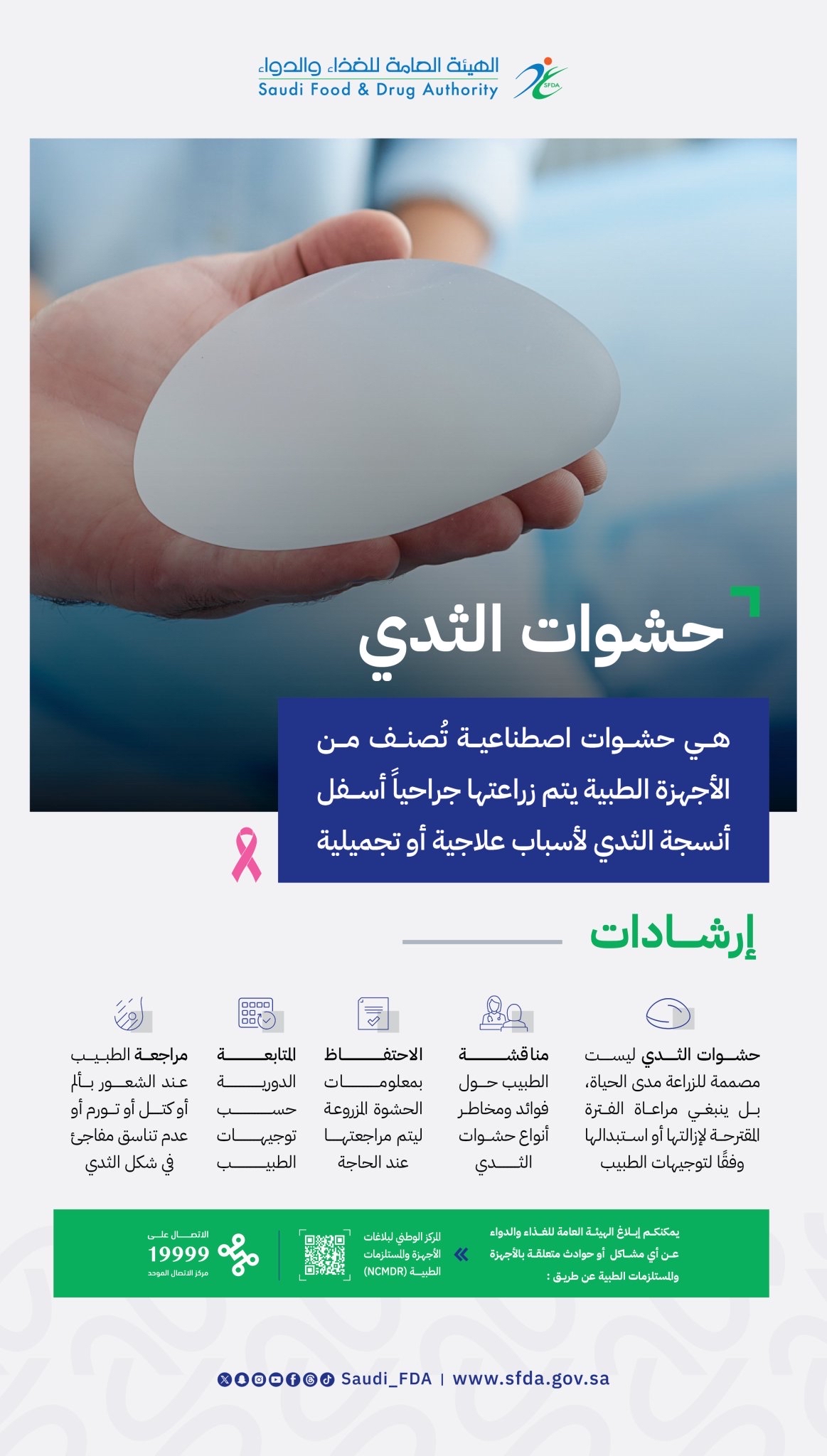 كشفت هيئة الغذاء والدواء أن حشوات الثدي ليست مصممة للزراعة مدى الحياة، وينبغي مراعاة الإرشادات في حال زراعتها لأسباب علاجية أو تجميلية.