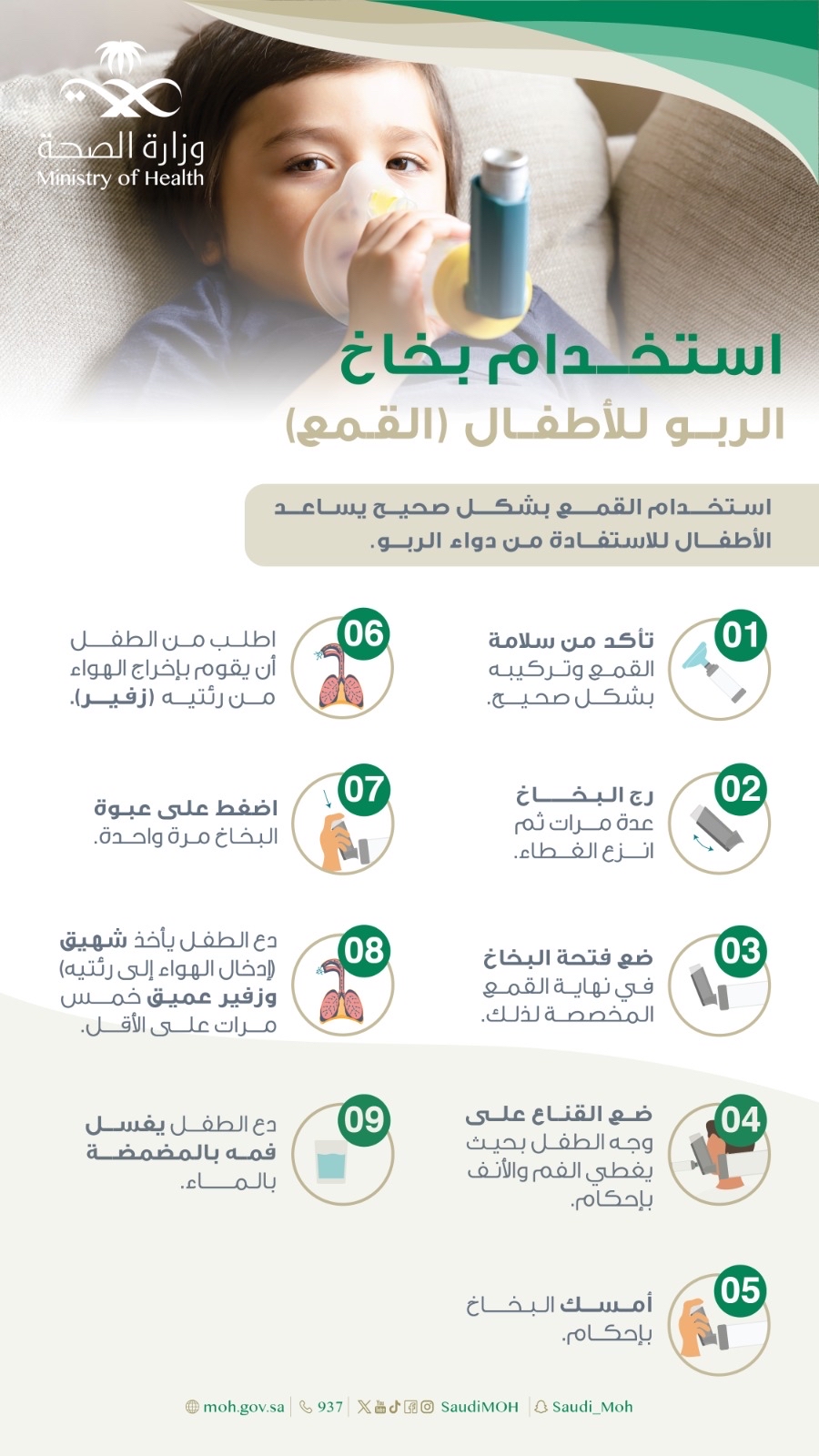 وتضمنت الخطوات أيضا وضع القناع على وجه الطفل بحيث يغطي الفم والأنف بإحكام، ثم إمساك البخاخ بإحكام، ثم الطلب من الطفل أن يقوم بإخراج الهواء من رئتيه «زفير» ثم الضغط على عبوة البخاخ مرة واحدة، وترك الطفل يأخذ شهيق لإدخال الهواء إلى رئتيه، ثم زفير عميق خمس مرات على الأقل.، وبعد ذلك يغسل الطفل فمه بالمضمضة بالماء.