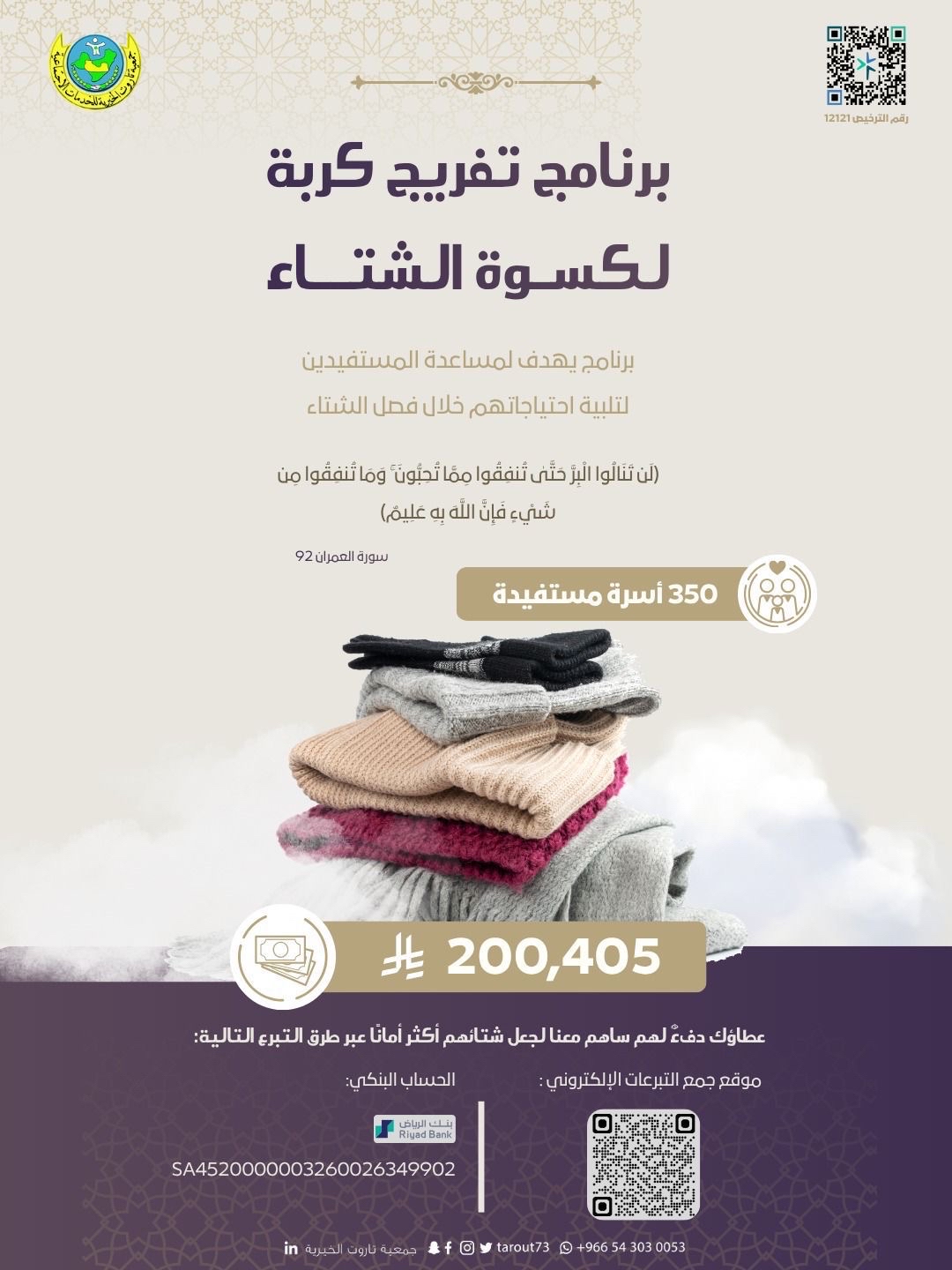 وتستهدف الحملة، التي انطلقت بترخيص يحمل الرقم 12121، جمع مبلغ إجمالي قدره 200,405 ريالات، وذلك لتغطية الاحتياجات الشتوية الأساسية للأسر المستهدفة.